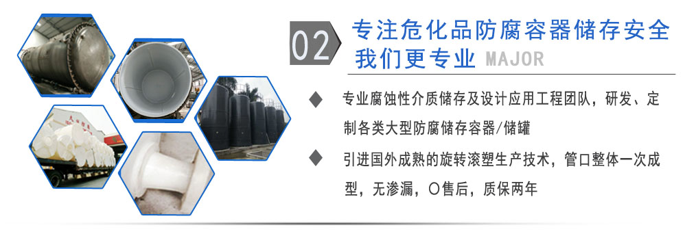 公司有鋼襯塑PE/PO、PE全塑、碳鋼、不銹鋼四大系列100多個品種,專注于常壓儲存容器生產,其產品包括鋼襯塑儲罐管口一體成型PE儲罐碳鋼儲罐不銹鋼儲罐、反應釜、攪拌罐、離子交換柱、鋼襯PE/PO儲罐塑料儲罐鹽酸儲罐硫酸儲罐等等。更大限度滿足廣大客戶的各種需求,同時可以根據客戶的需要加工定制各種防腐設備。